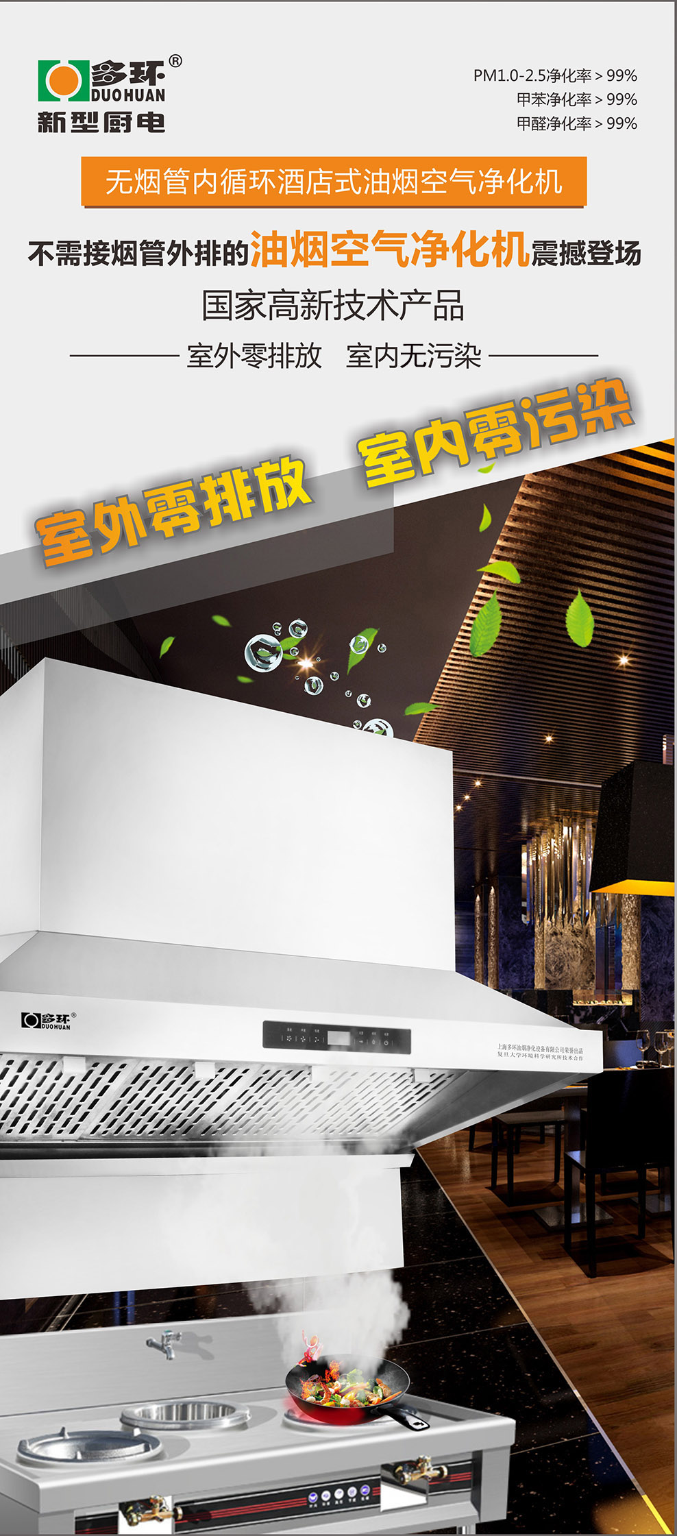 多環(huán)凈化設(shè)備公司研發(fā)生產(chǎn)的無(wú)管式內(nèi)循環(huán)油煙凈化機(jī)是不用煙管對(duì)外排放的油煙凈化設(shè)備,采用吸排凈化一體機(jī)的形式將烹飪產(chǎn)生的油脂、煙顆粒物及有害氣體(醛、苯、VOCs等)、異味(辣、臭、酸味等)和有害細(xì)菌在室內(nèi)進(jìn)行凈化處理的廚電產(chǎn)品。(*數(shù)據(jù)來(lái)源于上海市環(huán)境保護(hù)產(chǎn)品質(zhì)量監(jiān)督檢驗(yàn)總站出具的《檢測(cè)報(bào)告》報(bào)告編號(hào):2016|20-35-885523/2016|20-35-885524)