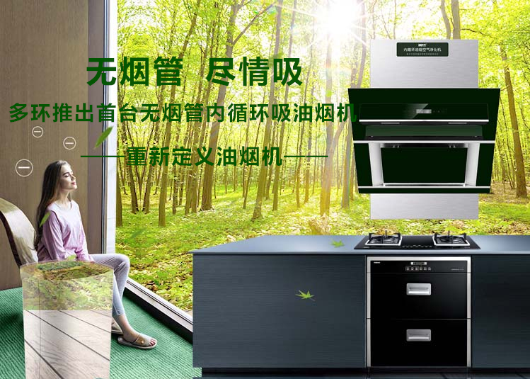 【無煙管內循環吸油煙機】:將烹飪過程中產生的油脂、煙霧、有害氣體、細菌和異味進行收集和凈化處理,無需對外接管排放,實現“室外不排放,室內無污染”。還可兼用于去除新裝修房子的甲醛等,使室內空氣長久清新。